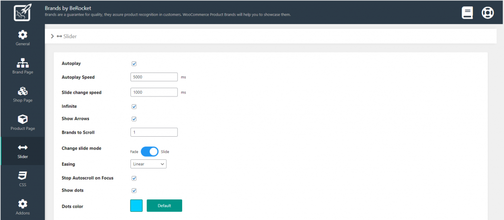 - Brands per row – brands columns. Brands per slider, when slider is enabled.