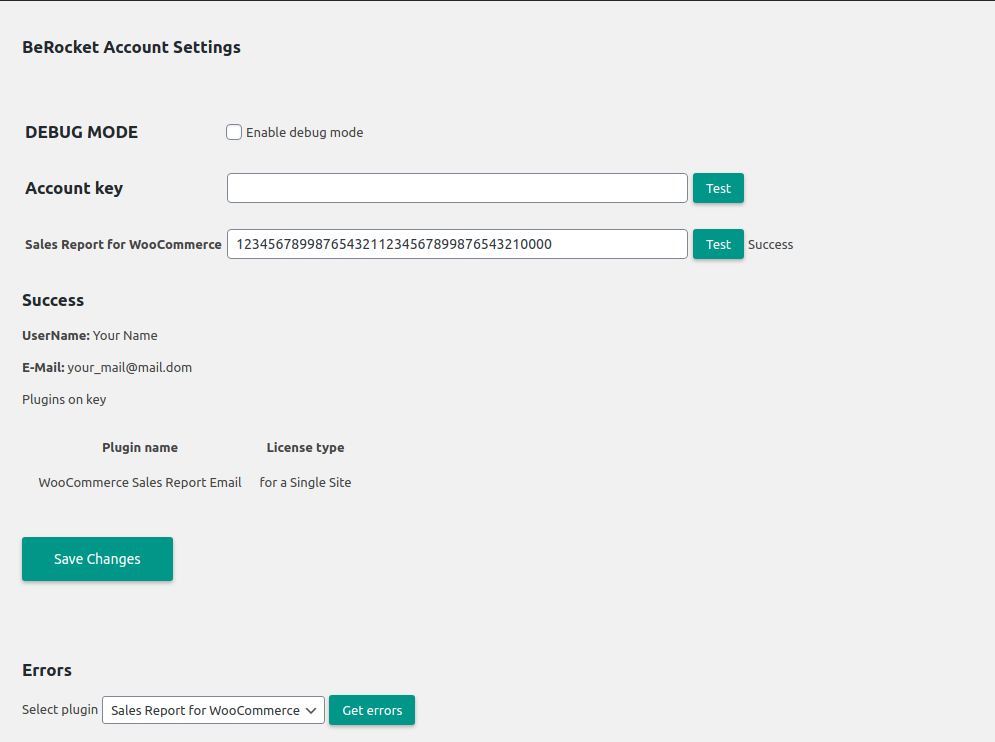 Как активировать ключ плагина? від | Apr 15, 2019 | 0 коментарівСкопируйте ключ плагина с сайта BeRocketВставьте этот ключ в поле WooСommerce Sales Reports EmailНажмите кнопку TestЕсли Вы используете правильный ключ плагина, Вы увидитеНажмите кнопку Save ChangesОпублікувати коментар Cancel replyYou must be logged in to post a comment.