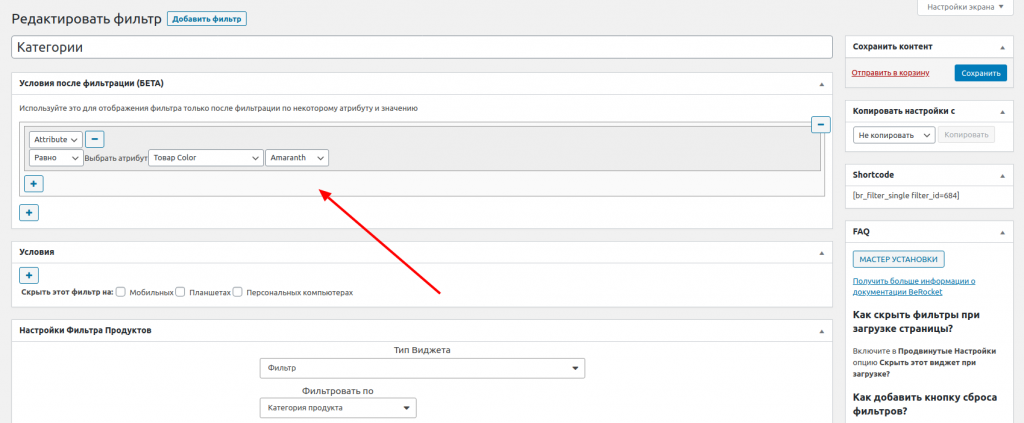 Условие можно установить пройдя в настройки фильтра. В “Условия после фильтрации (БЕТА)” нужно выбрать атрибут после фильтрации по которому будет выводится фильтр