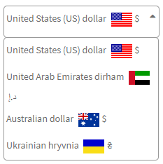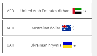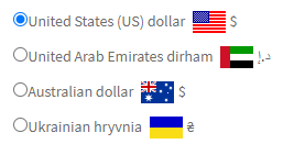 - currency_text – тип информации: текст, флаг, символ, изображение, пробел. Вы можете использовать один или больше типов (Например: “текст”, “флаг, текст”, “флаг, пробел, символ, пробел, текст”; используйте кому для разделения элементов)