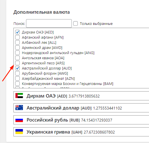 - Дополнительная валюта – таблица с валютой, которую можно использовать на сайте: