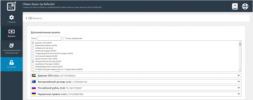 - Курсы валют – автоматическое обновление курса валют каждые 24 часа и после изменения валюты WooCommerce; при обмене умножьте валюту на это значение.