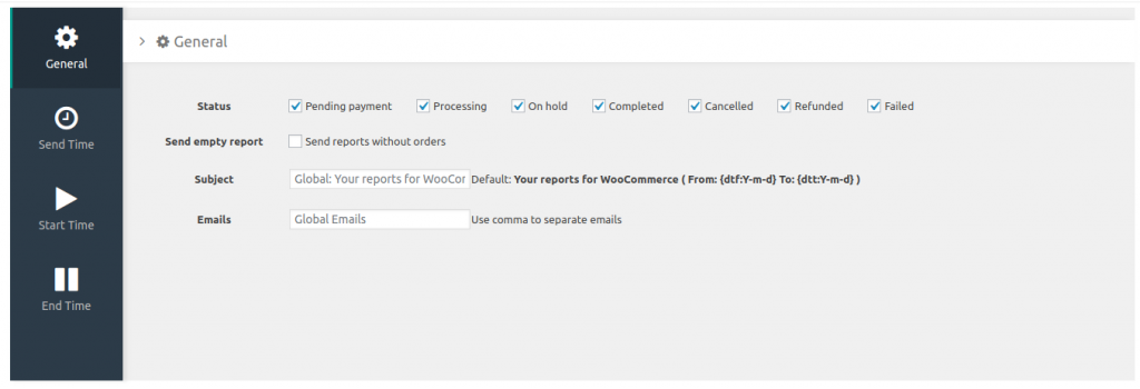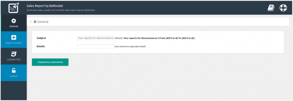 - Тема – тема почтового сообщения, которая будет во всех отчетах по умолчанию. Если поле оставить пустым будет Your reports for WooCommerce ( From: {dtf:Y-m-d} To: {dtt:Y-m-d} )