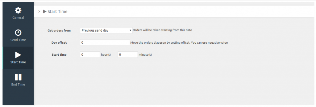 - Начало отправки – время с которого начнут браться заказы для отчета