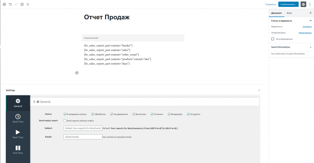 - Время отправки – время, когда будет отправлен отчет